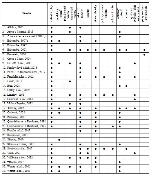 V analyzovaných výzkumných studiích byla identifikována řada alternativních učebních pomůcek a přístupů sloužících jako alternativy reálných pitev. Přehled přinášíme v tabulce 1. Jednotlivým pitevním alternativám se budeme věnovat podrobněji v dalším textu.